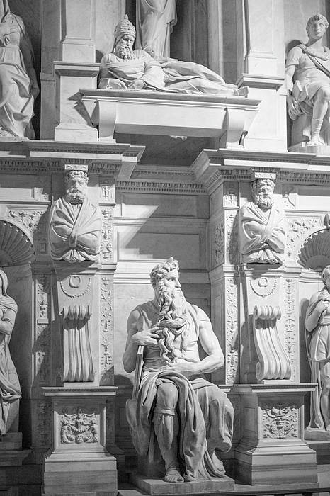A detailed marble sculpture of Michelangelo's magnificent Moses in Rome, surrounded by other intricately carved figures and decorative elements. The... more